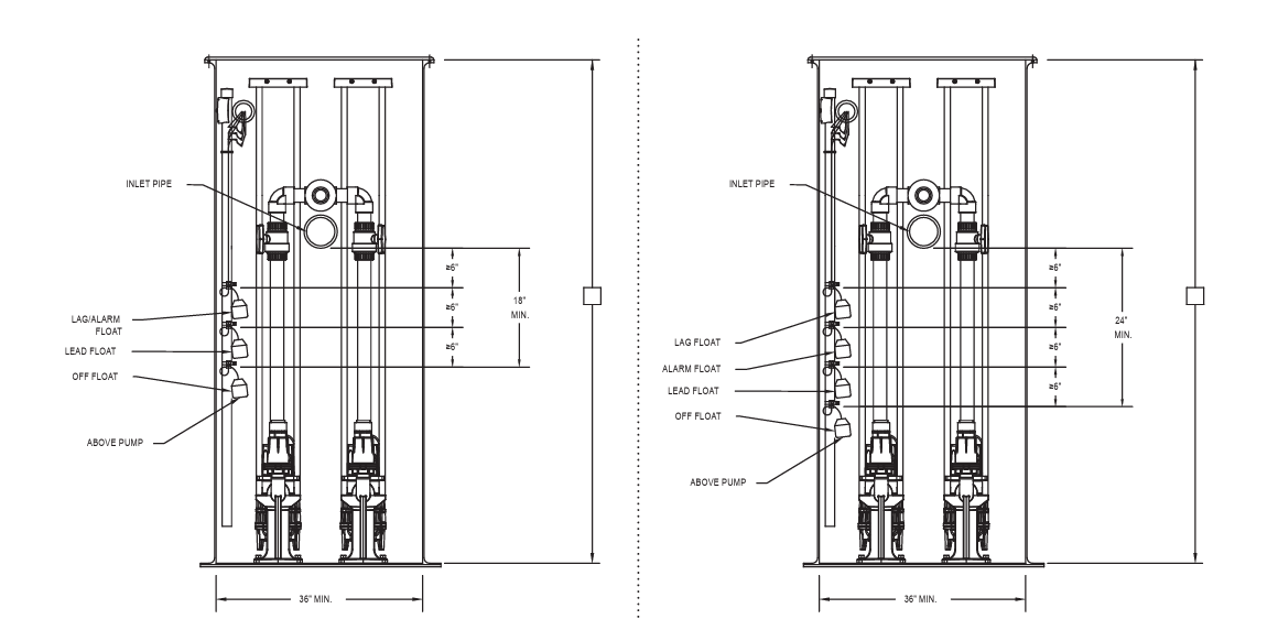 Working Volume: The space between the off float and the inlet. Zoeller recommends a minimum of 18” for three-float arrangements and 24” for four-float arrangements.